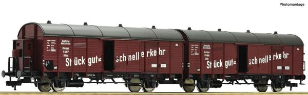 Leig-Wageneinheit, bestehend aus zwei gedeckten Güterwagen, Bauart Glh „Dresden?, der Deutschen Reichsbahn-Gesellschaft.